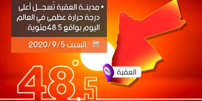 الأول نيوز – بعد اكتمال تسجيل درجات الحرارة العظمى لليوم السبت 5/9/2020 (بحسب منظمة الأرصاد العالمية المسؤولة عن تجميع درجات الحرارة المُسجلة لغايات التوثيق من مراصد الدول) فقد سجلت مدينة العقبة أعلى درجة حرارة عظمى على وجه الكرة الأضية لهذا اليوم السبت 5/9/2020، والتي سجلت درجة جرارة عظمى بواقع 48.5 درجة مئوية مُتجاوزة بذلك جميع الدول الخليجية في سابقة استثنائية و خاصة أنها احتلت يوم أمس كثاني أعلى درجة حرارة في الكرة الأرضية