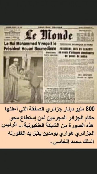 وكتب في التعليق المرافق للمنشور “800 مليون دينار جزائري الصفقة التي أعلنها حكام الجزائر لمن استطاع محو هذه الصورة من الشبكة العنكبوتية.. الرئيس الجزائري هواري بومدين يقبل يد المغفور له محمد الخامس”.