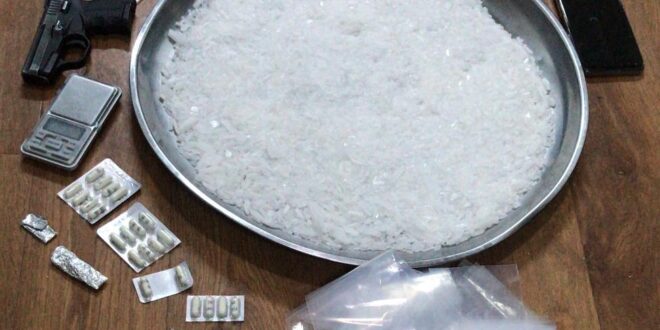 وفي محافظة اربد وردت لكوادر ادارة مكافحة المخدرات معلومات حول قيام احد الاشخاص المشبوهين بقضايا الاتجار بالمخدرات بتخزين كميات من مادة الكريستال المخدرة داخل منزله والاتجار بها حيث جرى بعد التأكد من تلك المعلومات مداهمته والقاء القبض عليه وبتفتيش المنزل عثر داخله على 3 كغم من مادة الكريستال المخدرة وكمية من الحبوب المخدرة وسلاح ناري .