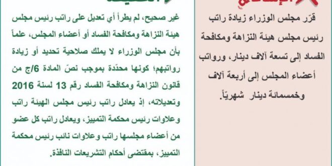 الأول نيوز – نفت الحكومة عبر منصة حقك تعرف اليوم الاثنين زيادة راتب رئيس مجلس هيئة النزاهة ومكافحة الفساد وأعضاء مجلس الهيئة.