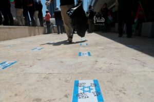 الأول نيوز – داس رؤساء غرف تجارية وممثلي قطاعات ورؤساء نقابات وجمعيات اصحاب العمل على علم الكيان الصهيوني الذي وضعوه أمام غرفة تجارة الاردن، ورفعوا الاعلام الفلسطينية والاردنية خلال الوقفة التضامنية والاحتفالية التي اقامتها اليوم السبت غرفة تجارة عمان، دعما لفلسطين وانتصارا لصمود اهالي قطاع غزة ، في وجه العدوان الاسرائيلي الغاشم.