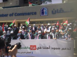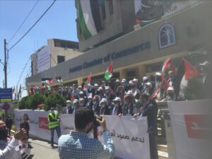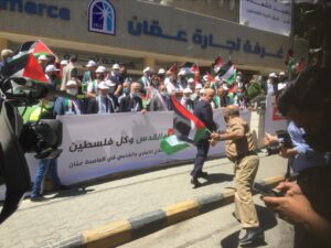 ورفع المشاركون بالاحتفالية، التي اقيمت امام مقر غرفة تجارة عمان، العلمين الاردني والفلسطيني، وشعارات تؤكد بان الوصاية الهاشمية على المقدسات “خط احمر”، وان الاردن هو الشريان والرئة للشعب الفلسطيني.