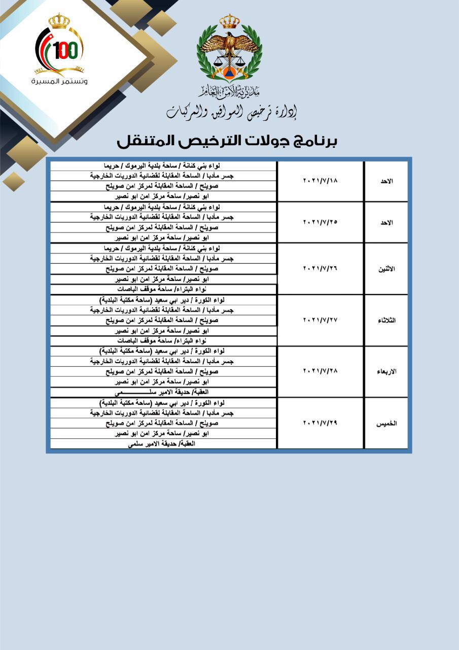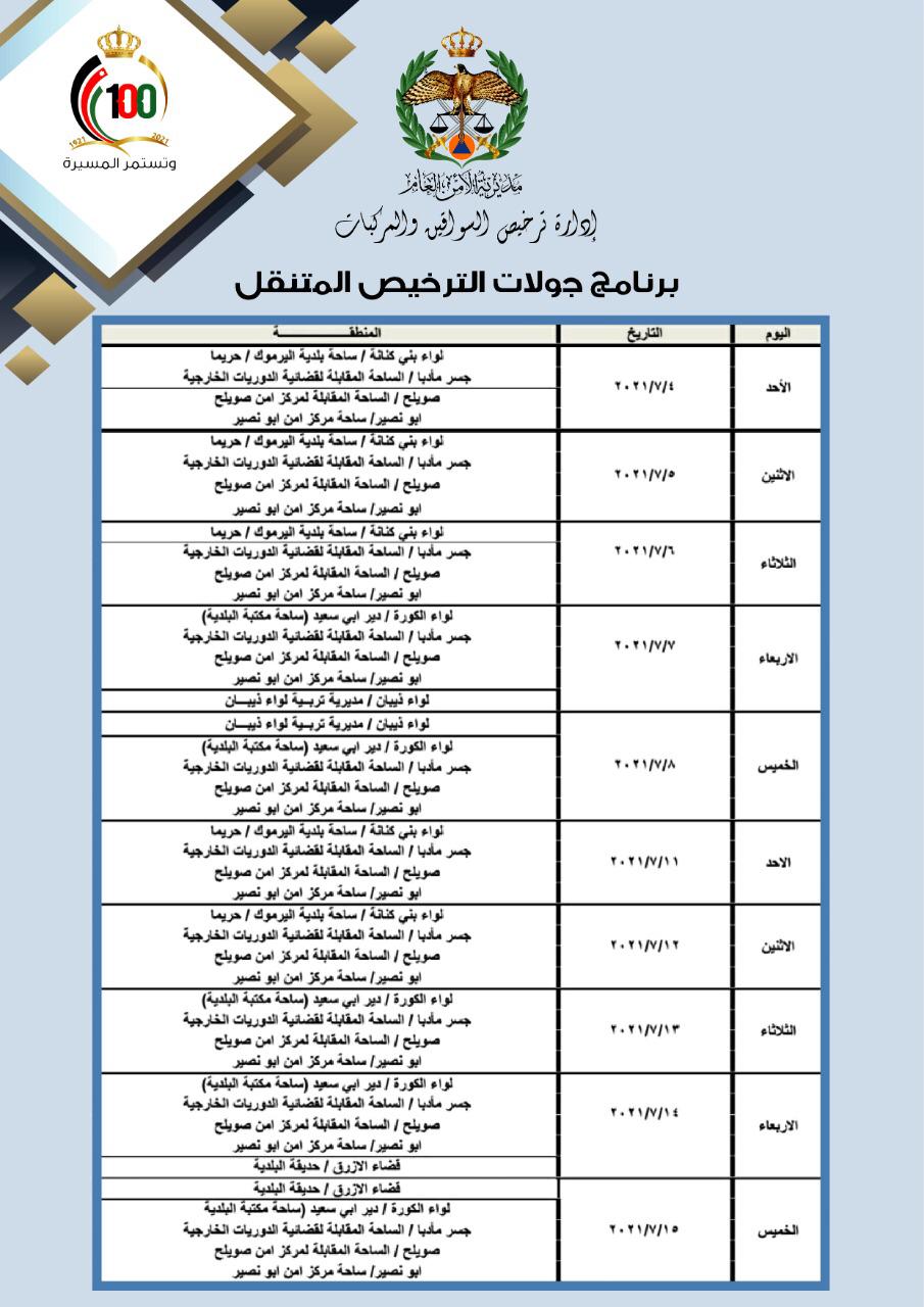 الاول نيوز – أعلنت إدارة ترخيص السواقين والمركبات، اليوم الإثنين، عن مواعيد العمل بجولات الترخيص المتنقل ضمن المبادرة الابتكارية ( بنوصلك ) خلال شهر تموز في عدد من مناطق المملكة.