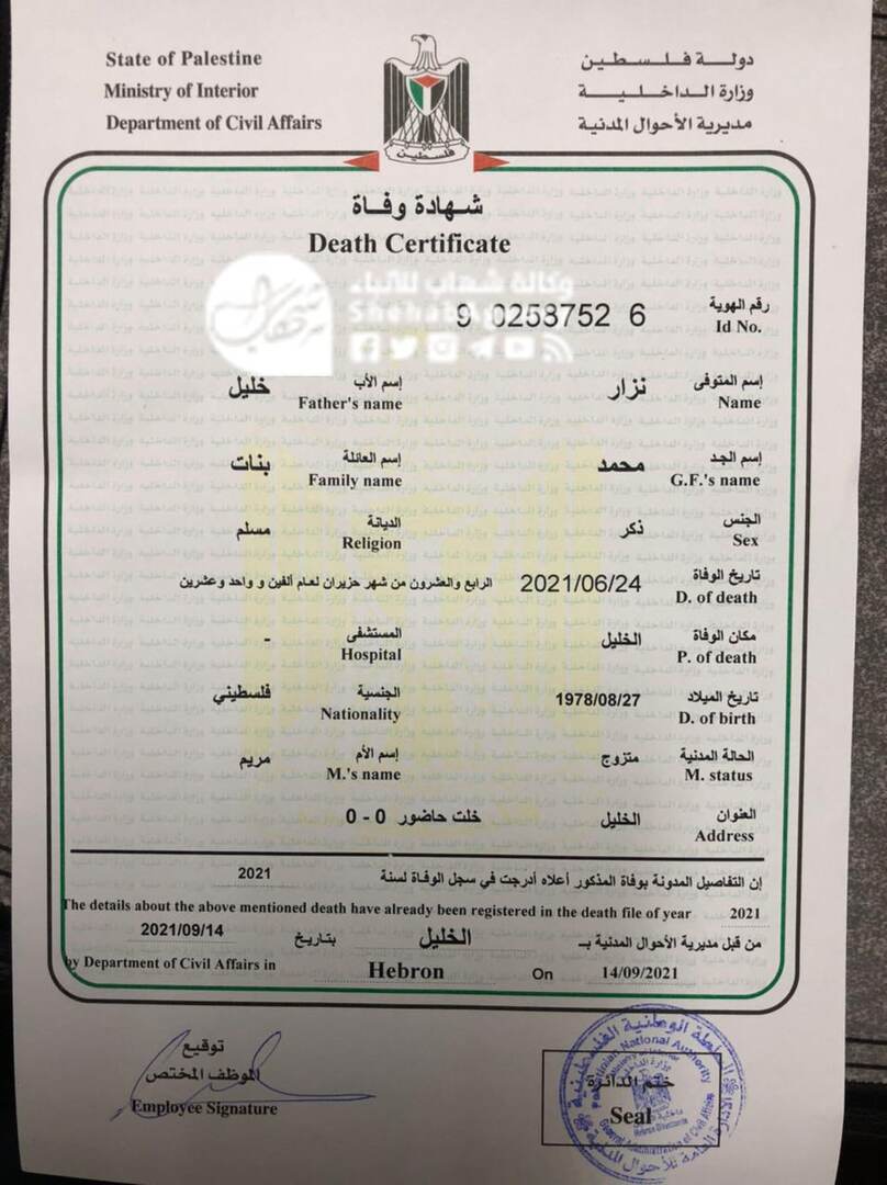 الأول نيوز – سلمت السلطة الفلسطينية عائلة الناشط الراحل نزار بنات تصريح دفنه، وتقرير الطب العدلي، وذلك بعد أشهر من مقتله ودفنه.
