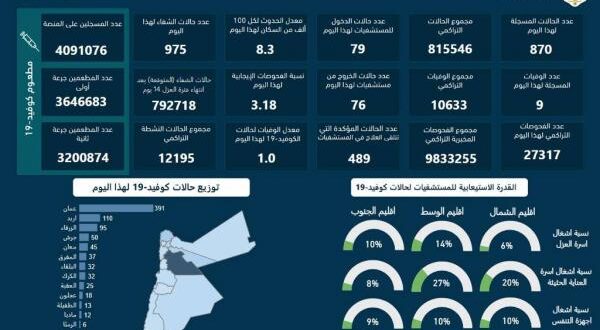9 وفيات و870 اصابة كورونا جديدة بالأردن