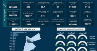 الأول نيوز – أعلنت وزارة الصحة، الأربعاء، عن تسجيل 6 وفيات و1116 إصابة جديدة بفيروس كورونا في المملكة، ليرتفع العدد الإجمالي إلى 10574 وفاة 810559 إصابة. وبلغت نسبة الفحوصات الإيجابيّة لهذا اليوم 3.41 المئة، بحسب الموجز الإعلامي الصادر عن الوزارة. وأشار الموجز إلى أن عدد الحالات النشطة حالياً وصل إلى …