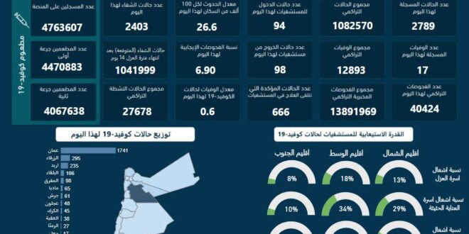 الأول نيوز – اعلنت وزارة الصحة ، الاثنين ، تسجيل الاردن: 17 وفاة و 2789 اصابة جديدة بكورونا فيما بلغت النسبة الايجابية للفحوصات 6.9 %