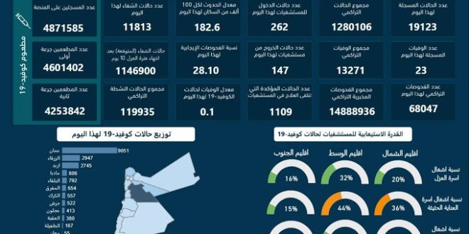 الأول نيوز – أعلنت وزارة الصحة الخميس، تسجيل 23 وفاة و19123 إصابة جديدة بفيروس كورونا في المملكة، ليرتفع إجمالي الوفيات إلى 13271 وفاة والإصابات إلى 1280106 إصابات.