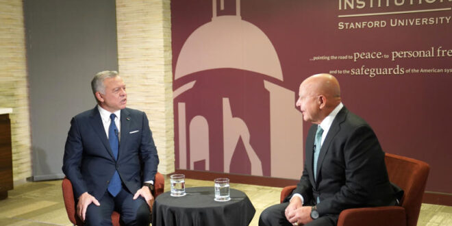 الأول نيوز- أجرى جلالة الملك عبدالله الثاني خلال زيارته إلى الولايات المتحدة الأمريكية، الأسبوع الماضي، مقابلة مع الجنرال المتقاعد هربرت ماكماستر ضمن البرنامج العسكري المتخصص (Battlegrounds)، الذي ينتجه معهد هوفر في جامعة ستانفورد الأمريكية.