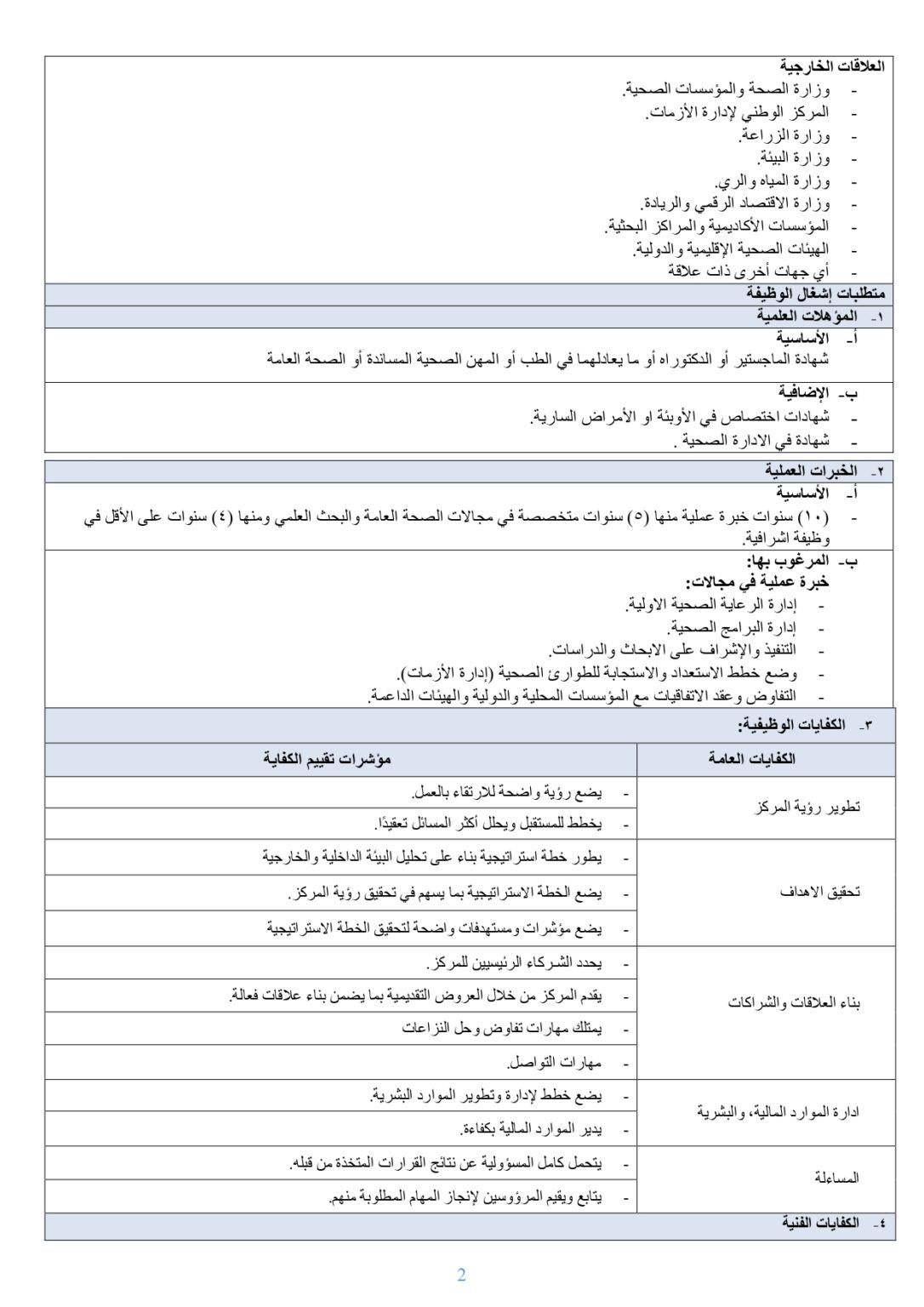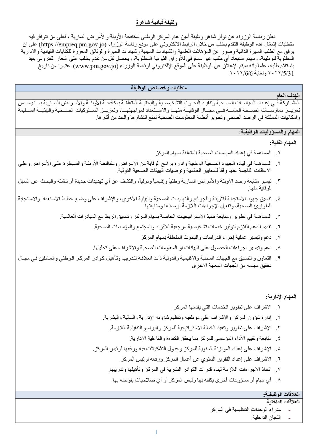 الأول نيوز – أعلنت رئاسة الوزراء اليوم الثلاثاء، عن شاغر وظيفة أمين عام المركز الوطني لمكافحة الأوبئة والأمراض السارية.