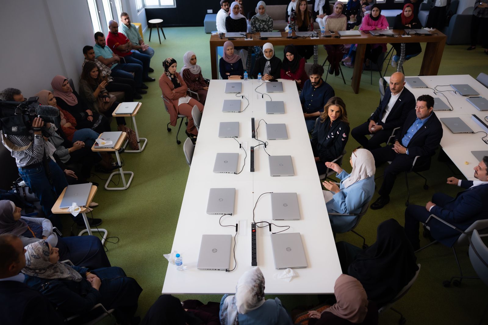وبحضور الرئيس التنفيذي لشركة ايستارتا للبرمجيات الدكتور معتز النابلسي ومجموعة من الفريق التنفيذي للشركة ومنسق المركز أحمد مرايات، التقت جلالتها في قاعة التدريب الرئيسية عدداً من المتدربين المشاركين في دورة لشركة البرمجيات ايستارتا والتي سيتم على أثرها توظيف الناجحين بها في الشركة سواء في مقرها في عمان أو من مناطق سكناهم في محافظة الطفيلة.