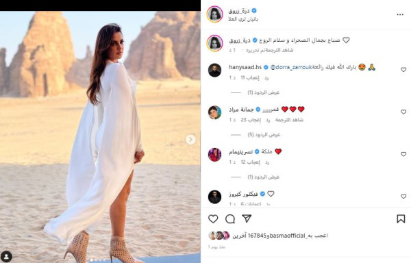 و علقت درة على صورها قائلة: “صباح بجمال الصحراء وسلام الروح”، ولاقت الصورة تفاعل كبير من الجمهور بسبب جمال إطلالتها الملفتة والمكياج الناعم التي اعتمدته في هذه الجلسة.