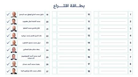 والمترشحون هم: أحمد حسين وعبد الله العدوان ومنصور الشافعي وعواد البليلات.