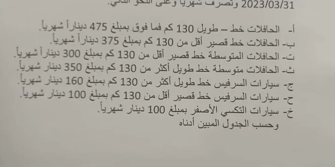 – سيارات السرفيس خط قصير اقل من 130 كيلو متر مبلغ 100 دينار شهريا.