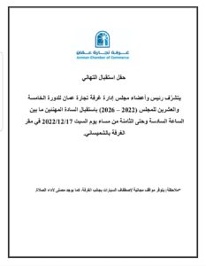 الأول نيوز – أعلنت غرفة تجارة عمان اليوم الخميس عن استقبال المهنئين بفوز مجلس إدارة غرفة تجارة عمان المنتخب للدورة الخامسة والعشرين للمجلس، ونيلهم ثقة زملائهم من اعضاء الهيئة العامة وذلك يوم السبت 17/12/2022 ما بين الساعة السادسة مساء وحتى الساعة الثامنة مساء في مقر الغرفة/الشميساني.