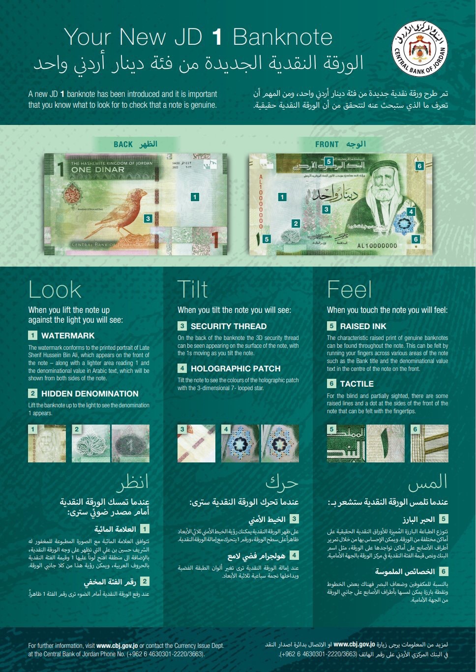 وقال البنك في بيان، إنه سيتم طرح فئات الإصدار الجديد (الإصدار الخامس) في التداول تدريجيا جنباً إلى جنب مع فئات الإصدار الحالي للأوراق النقدية التي تتزين بصور الملوك الهاشميين كما هي في الإصدار الرابع.