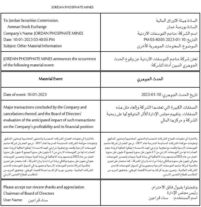 الأول نيوز – في ادراج لها على موقع هيئة الأوراق المالية وبورصة عمان، افصحت شركة مناجم الفوسفات الأردنية عن الاتفاقية التي ابرمتها مؤخرا مع مجموعة افكو الهندية (تعاونية مزارعي الهند) والتي نصت على زيادة حجم الصادرات بنحو 3 مليون طن سنويا بدلا من 2.1 مليون سنويا.