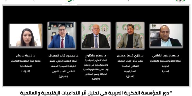 الأول نيوز – عقد منتدى الفكر العربي بالتعاون مع المعهد العالمي للتجديد العربي ومقره مدريد، لقاءً حوارياً ووجاهياً عبر تقنية الاتصال المرئي، حاضر فيه أستاذ الاقتصاد الدولي وعضو الهيئة التأسيسية للمعهد العالمي للتجديد العربي الدكتور محمود خالد المسافر حول”دور المؤسسة الفكرية العربية في تحليل أثر التداعيات الإقليمية والعالمية على المنطقة العربية في ضوء الحرب الروسية – الأوكرانية”، وشارك بالمداخلات، في هذا اللقاء الذي أداره أستاذ العلوم السياسية والاستراتيجية في جامعة نايف العربية للعلوم الأمنية سابقاً وعضو المنتدى الدكتور عصام ملكاوي، كل من: السفير الأسبق ومدير المعهد العراقي للدراسات الاستراتيجية الدكتورغازي فيصل حسين من العراق، والدكتور داود حسن كاظم من وحدة الدراسات العلمية في المعهد العالمي للتجديد العربي، وأستاذ العلوم السياسية والعلاقات الدولية الدكتور عصام عبد الشافي من مصر، ومديرة مركز المتوسط للدراسات الاستراتيجية الدكتورة لامية حروش من الجزائر، وحضر اللقاء نخبة من أعضاء المؤسستين وعدد من الباحثين والمهتمين.