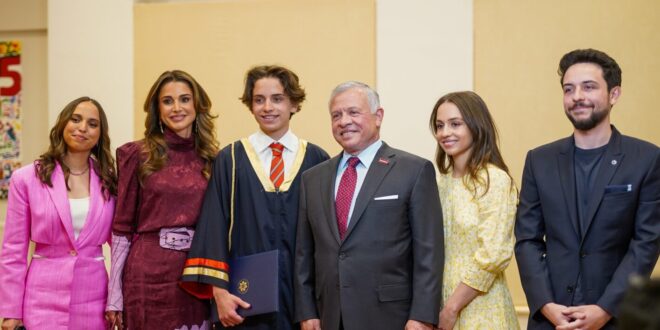 الأول نيوز – حضر جلالة الملك عبدالله الثاني وجلالة الملكة رانيا العبدالله وسمو الأمير الحسين بن عبدالله الثاني، ولي العهد، حفل تخريج سمو الأمير هاشم بن عبدالله الثاني من مدرسة كينغز أكاديمي بمادبا، بعد إنهائه مرحلة الثانوية العامة.