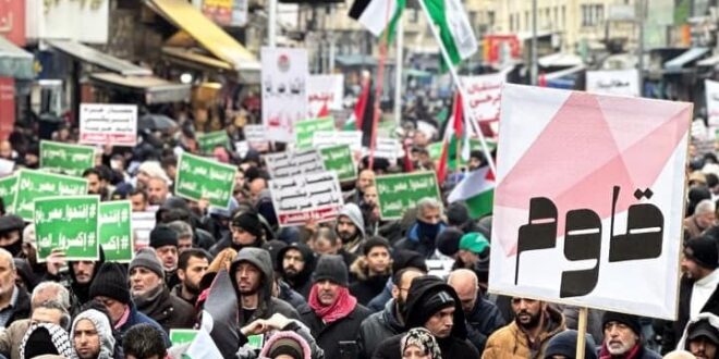 الأول نيوز – لم تمنع الاحوال الجوية الباردة والماطرة، من مشاركة آلاف الاردنيين في المسيرة الحاشدة التي انطلقت بعد صلاة ظهر الجمعة من أمام المسجد الحسيني في منطقة وسط البلد، بدعوة من الملتقى الوطني لدعم المقاومة وحماية الوطن.