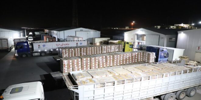 وحملت القافلة المكونة من 75 شاحنة الطرود الغذائية لتعبر جسر الملك حسين نحو معبر كرم أبو سالم ليصار إلى إيصالها وتسليمها لأهلنا في غزة وتوزيعها من خلال الجمعيات والمنظمات الشريكة في القطاع.