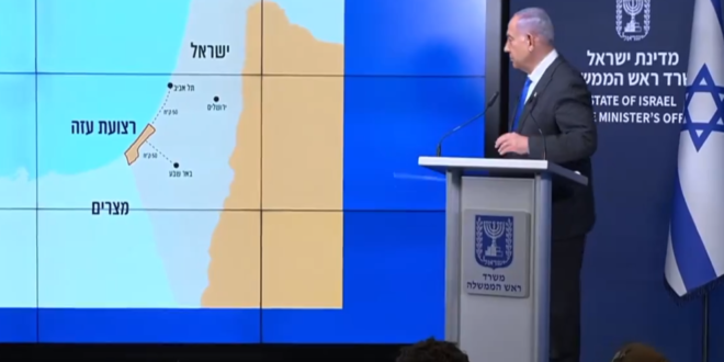 الأول نيوز – قدم رئيس الوزراء الإسرائيلي بنيامين نتنياهو، الاثنين، شرحا تفاعليا على لوحة إلكترونية عن محور فيلادلفيا (صلاح الدين) الحدودي بين قطاع غزة ومصر، ضمن خريطة للأراضي الفلسطينية خلت من أي إشارة للضفة الغربية المحتلة منذ 1967 والتي حاولت إسرائيل ضم أراض منها.