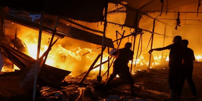 وبعد فترة وجيزة من مجزرة النصيرات، استهدف الاحتلال خياما تؤوي نازحين في مستشفى شهداء الأقصى بدير البلح، وذكر الدفاع المدني أن طواقمه تحاول السيطرة على الحريق الذي اندلع في خيام النازحين بالمستشفى.