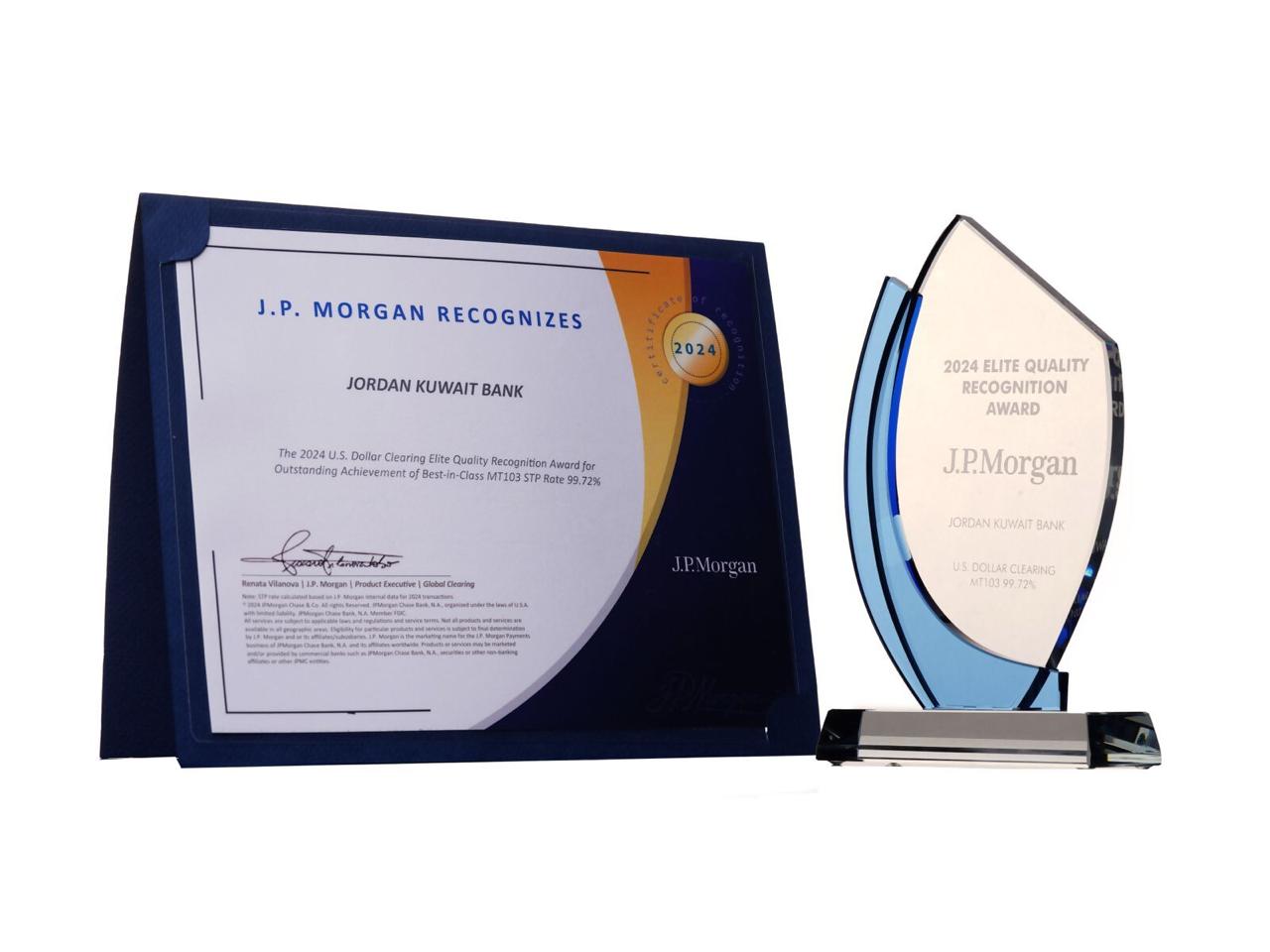 وقامت جي بي مورغان تشيس بمنح الجائزة للبنك الأردني الكويتي تقديراً لدقته في إنجاز حوالاته الخارجية، حيث أظهرت العمليات المصرفية الآلية للبنك نسبة دقة وصلت إلى 99.72%، ما يعكس التزام البنك بتقديم خدمات عالية الجودة تلبي احتياجات عملائه في تنفيذ حوالاتهم بالدولار الأمريكي بأعلى مستويات السرعة والدقة، مع تقليل التكاليف والمخاطر.