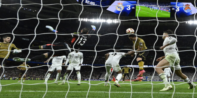 نجا ريال مدريد من فخ ضيفه ريال سوسييداد وبلغ المباراة النهائية لمسابقة كأس إسبانيا في كرة القدم بتعادله معه في مباراة مجنونة 4-4 بعد التمديد الثلاثاء، على ملعب “سانتياغو برنابيو” في مدريد في إياب الدور نصف النهائي.