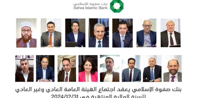 الأول نيوز – عقد بنك صفوة الإسلامي اجتماعي الهيئة العامة العادي وغير العادي للسنة المالية المنتهية في 31 كانون الأوّل 2024، عبر الوسائل المرئية والإلكترونيّة وبمشاركة مساهمين يُمثّلون ما نسبته (85.816%) من رأسمال البنك حضورًا بالأصالة أو الوكالة.