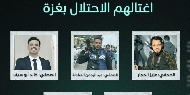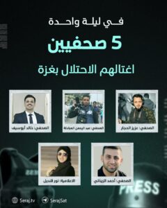 الأول نيوز – تستمر قوات الاحتلال الصهيوني في قتل الحقيقة في غزة، وأستهداف حراسها حيث استشهد 5 صحفيين اليوم الأحد في غارات إسرائيلية متفرقة على قطاع غزة، ليرتفع عدد الصحفيين الذين قتلتهم إسرائيل منذ بدء الإبادة إلى أكثر من 222 صحفيا.