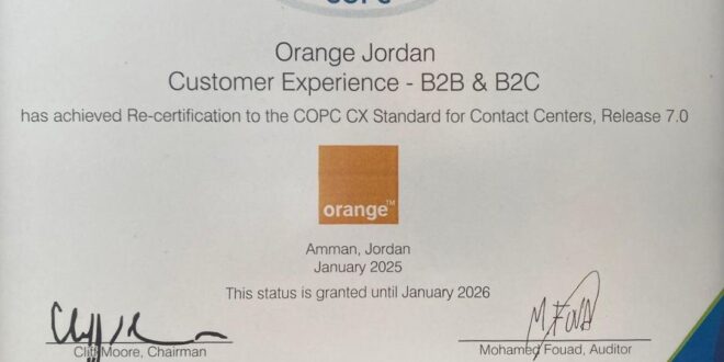 وتُمنح شهادة COPC للمؤسسات التي تحقق أداءً متميزاً في عمليات الزبائن، وتأتي هذه الخطوة لتؤكد جهود أورنج الأردن المستمرة في الحفاظ على جودة الخدمات وتعزيزها، بما يضمن تقديم تجربة متكاملة ومتميزة للزبائن عبر مختلف نقاط التواصل.