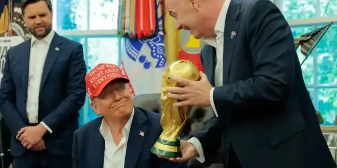 وخلال تواجده في المكتب البيضاوي، إلى جانب رئيس الاتحاد الدولي لكرة القدم (فيفا)، السويسري جاني إنفانتينو، ظهر الرئيس الأمريكي ممسكًا بكأس العالم، وهو يرتدي قبعة حمراء تحمل شعار: “ترامب كان محقًا في كل شيء”.