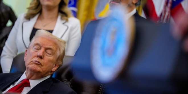 الأول نيوز – أثارت صور متداولة على مواقع التواصل الاجتماعي للرئيس الأمريكي دونالد ترامب نائما خلال مؤتمر صحفي في المكتب البيضاوي موجة من الجدل والانتقادات من معارضيه.