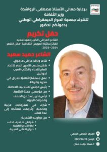 الأول نيوز – تحتفي جمعية الحوار الديمقراطي الوطني بالشاعر العربي الكبير حميد سعيد صديق الجمعية بمناسبة فوزه بجائزة العويس الثقافية.