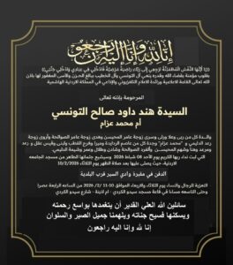 التي أنتقلت إلى رحمة الله تعالى يوم الأحد 08 شباط 2026 وسيشيع جثمانها الطاهر من مسجد الجامعه الاردنية، حيث يصلى عليها بعد صلاة الظهر يوم الثلاثاء 10/2/2026 ثم إلى مثواها الأخير في مقبرة وادي السير بجانب الأمانه