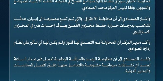 وأشار الصمادي إلى أن محاولة الاختراق، والتي تم تتبع مصدرها إلى إيران، هدفت للتلاعب بدرجات حرارة حفظ مخزون القمح بهدف إحداث ضرر في المخزون الاستراتيجي.