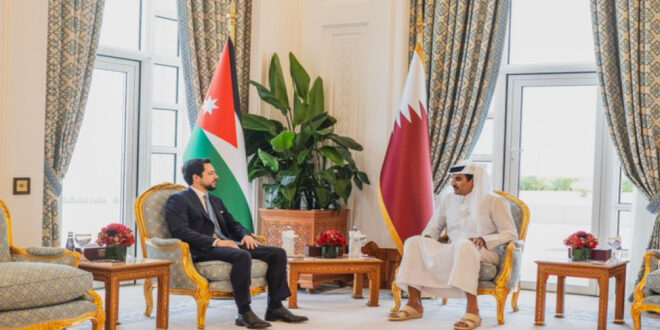 ونقل سمو ولي العهد، خلال اللقاء الذي عقد في الديوان الأميري في الدوحة، تحيات جلالة الملك عبدﷲ الثاني إلى أخيه سمو الشيخ تميم، وتمنياته له بدوام الصحة والعافية، كما حمّل أمير دولة قطر، سمو ولي العهد تحياته لجلالة الملك.