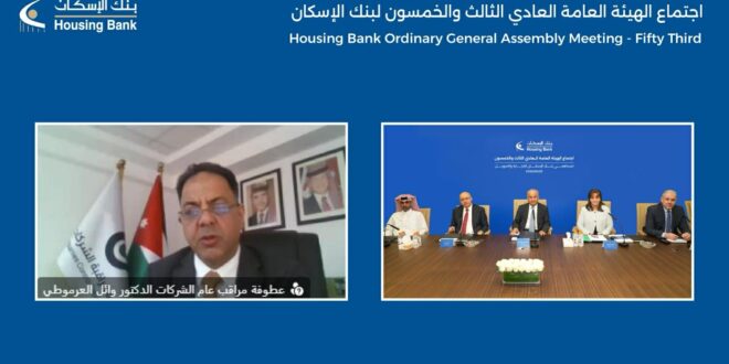 الأول نيوز – وافقت الهيئة العامة لمساهمي بنك الإسكـان للتجارة والتمويل في اجتمـاعها العادي بتاريخ 23/04/2026 على البيانات المالية لعام 2025 بما في ذلك الموافقة على توصية مجلس الإدارة بتوزيع أرباح نقدية بنسبة (30%) من القيمة الاسمية للسهم لمساهمي البنك عن عام 2025، كما صادقت على تقرير مجلس الإدارة لعام 2025 والخطة المستقبلية لعام 2026 وعلى تقرير مدققي حسابات البنك للعام 2025 وانتخاب شركة برايس ووتر هاوس كوبرز (PWC) لتدقيق حسابات البنك للعام 2026.