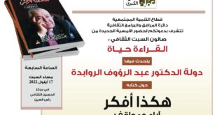 الأول نيوز – يحلُّ رئيس الوزراء الأسبق الدكتور عبد الرؤوف الروابدة ضيفا على “صالون السبت الثقافي: القراءة حياة”، الذي تنظمه دائرة المرافق والبرامج الثقافية في أمانة عمان الكبرى عند السابعة من مساء بعد غد السبت في المركز الثقافي برأس العين. ويتحدث الروابدة في الأمسية حول كتابه “هكذا أفكر: آراء ومواقف”، …